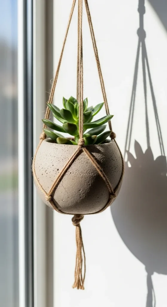 Thread jute or cotton cord through the holes and knot underneath. Keep the design simple if you’re new. Smooth white, speckled, or terrazzo styles work well.