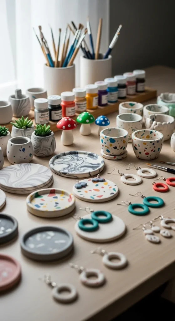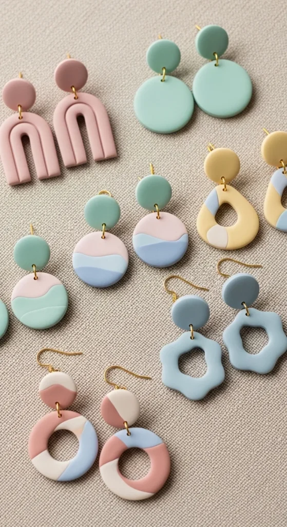 Clay earrings are one of the easiest entry projects. Roll clay thin and cut shapes using cookie cutters or a knife. Circles, arches, and abstract shapes work great.