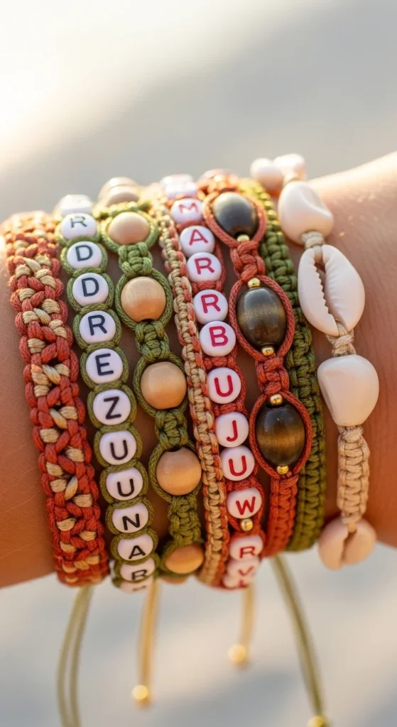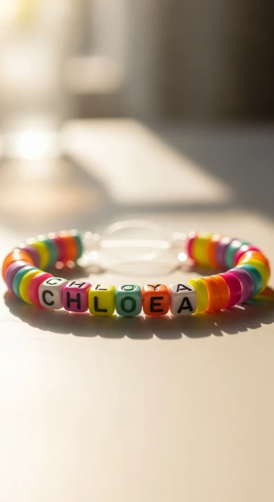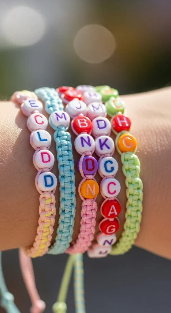 Alphabet bead bracelets are popular because they feel personal. Use short phrases, initials, or song inspired words.