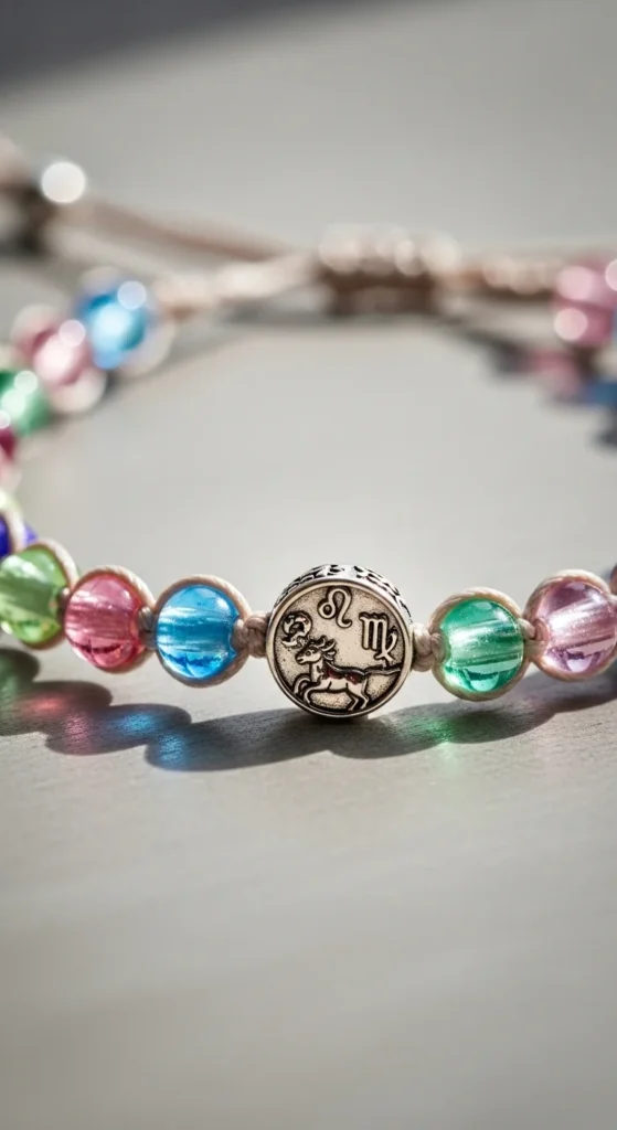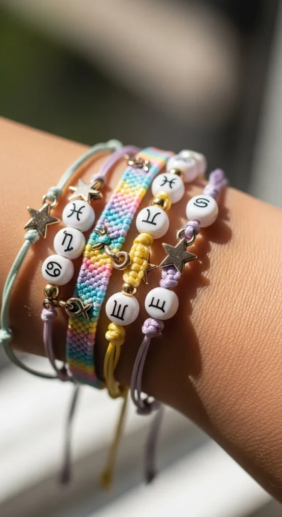 Zodiac bracelets focus on identity themes. Choose birth sign charms and matching colors.