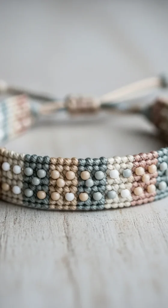 Eco bracelets use cotton threads and neutral palettes.