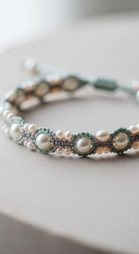 Pearl accents create a dressy bracelet style. Add pearls between knot sections.