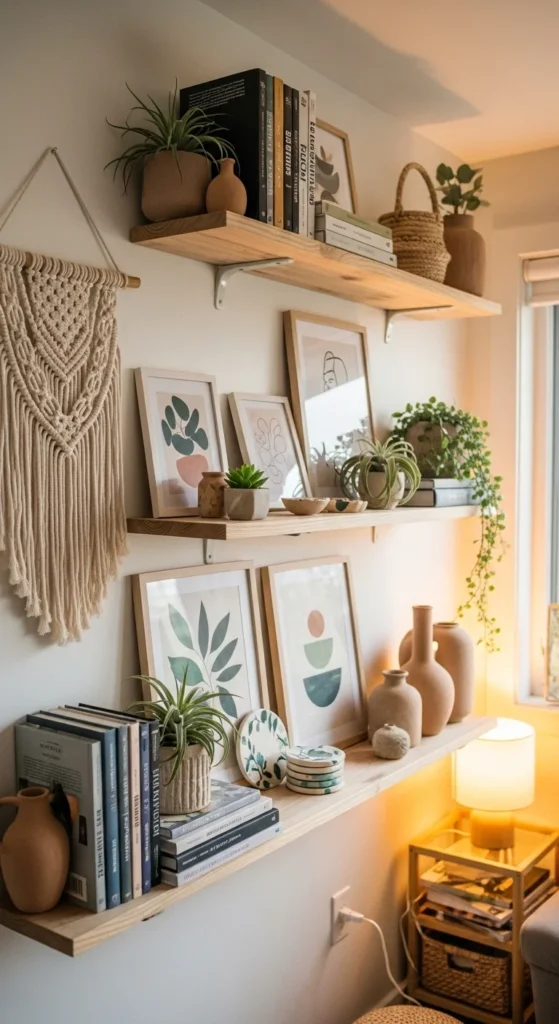 These elements bring warmth and make shelves feel more lived-in and inviting.