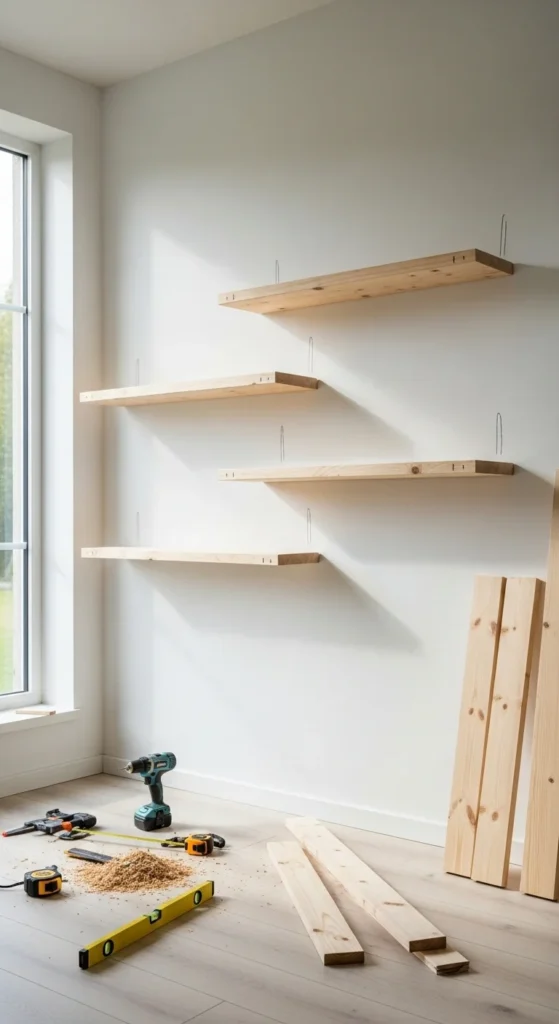 Use painter’s tape to outline shelf placement on the wall. This helps you visualize the final result and adjust before committing.