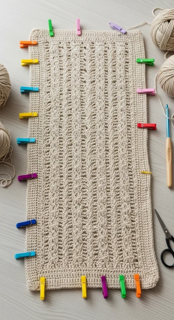 Use a foundation double crochet row if possible — it stretches and prevents curling.
