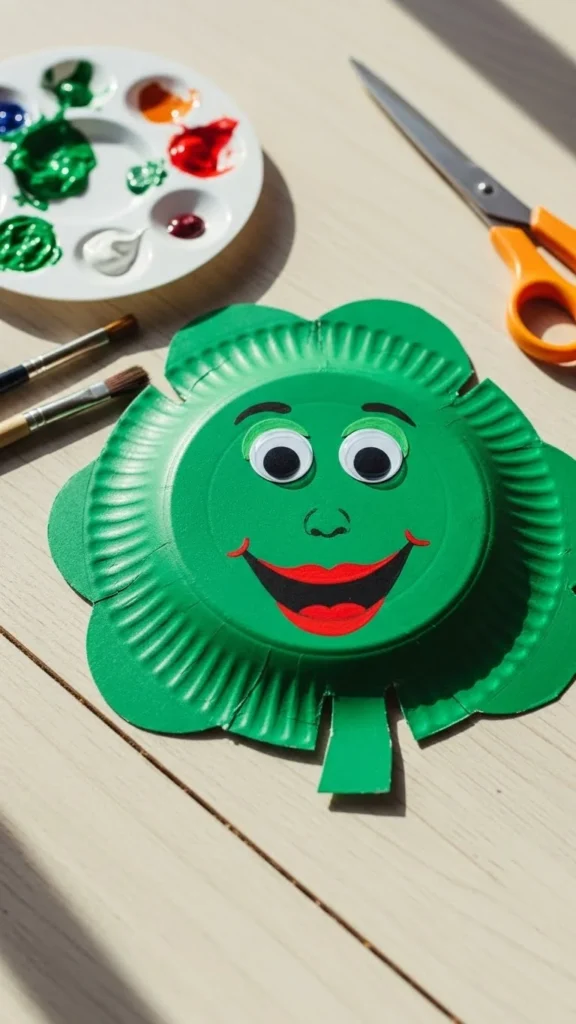 Paper plates make crafting simple and forgiving. Start by painting the plate green or covering it with green paper. Let it dry while cutting small shamrock shapes from scrap paper. Glue the shapes around the edges to form a clover look. Add eyes using markers, paper circles, or buttons, then draw a friendly smile.