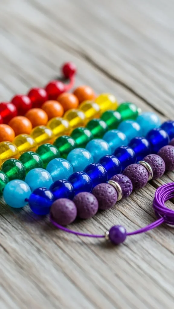 String beads in rainbow order onto elastic cord. Tie a secure knot and trim the ends.