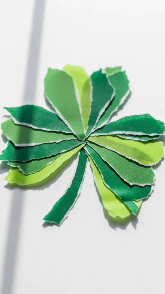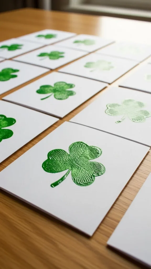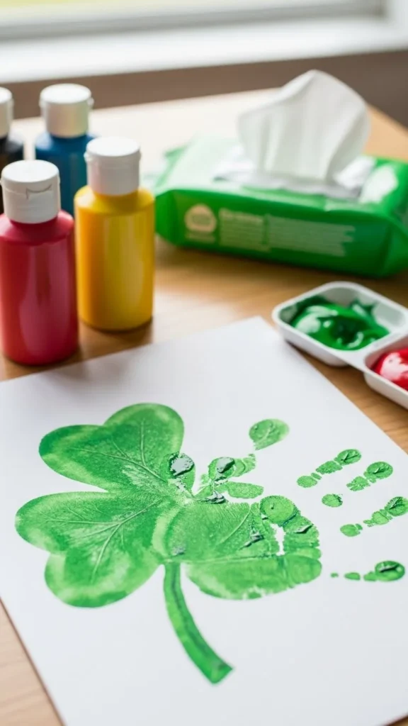 Handprint art adds a personal touch. Paint a hand green and press it onto paper three times to form a clover shape. Add a stem using a finger or small brush. Let the paper dry flat to avoid smudging.