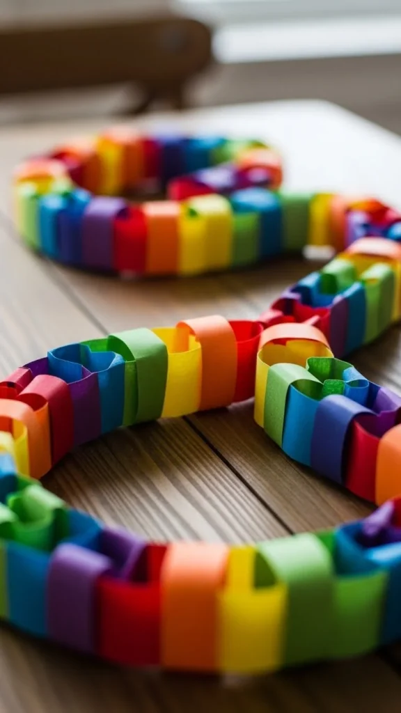 Paper chain garlands are quick and relaxing to make. Cut paper into even strips and loop each piece into a circle. Glue or tape the ends, then link the loops together in rainbow order. Scrap paper, magazines, or old notebooks work well here.