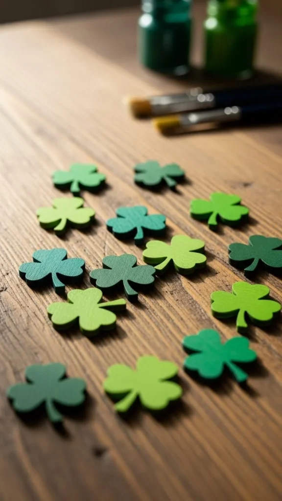 Paint wooden shamrock shapes using thin layers for quick drying.