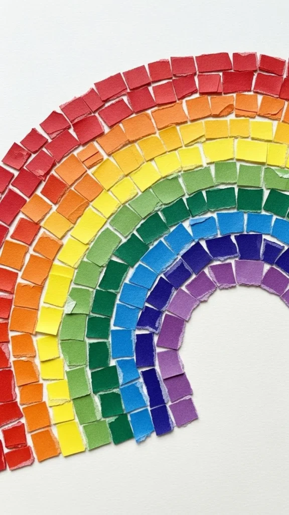 Tear paper into small pieces and glue them by color into rainbow shapes.