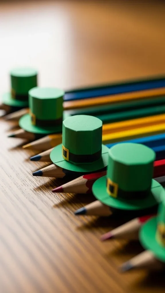 Pencil toppers are small but fun. Cut green paper into rectangles and roll them into short tubes. Glue the edges and add a flat circle for the hat brim. Yellow paper scraps make simple buckles.
