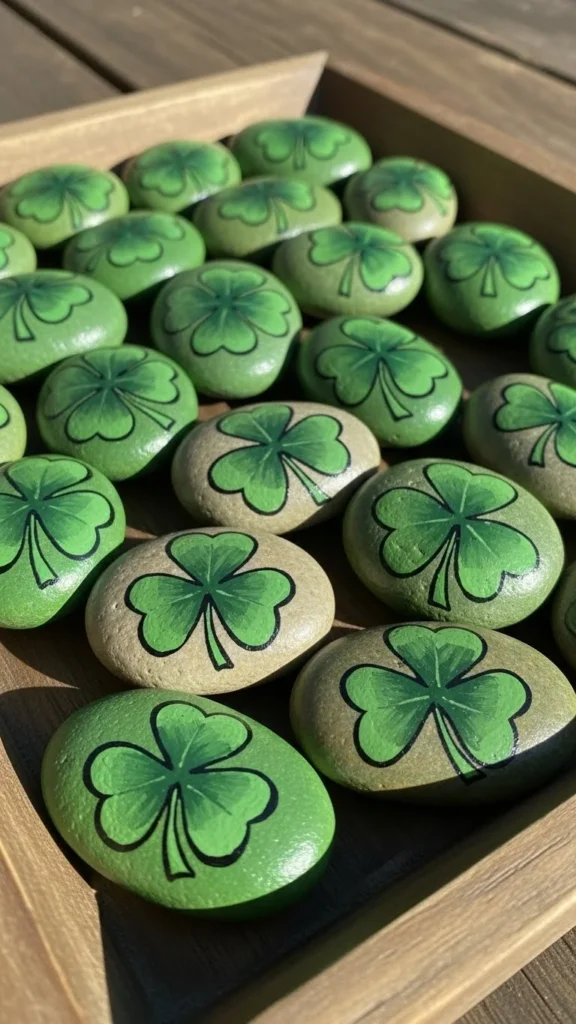 Painted rocks are simple and creative. Wash and dry smooth rocks first. Paint them green and add shamrock shapes using lighter shades. Let them dry completely.