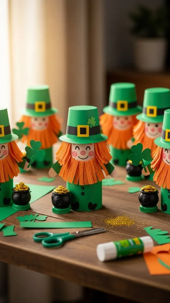 Empty paper rolls turn into fun figures. Cover the roll with green paper and add a paper hat, beard, and simple face. Glue everything in place.