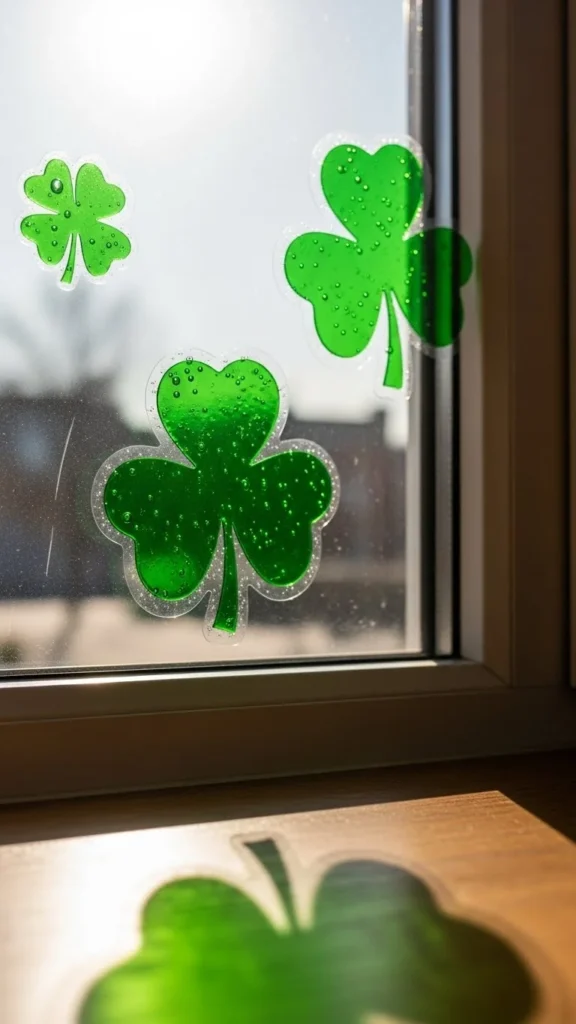 Mix clear glue with green paint and spread it onto plastic sheets in shamrock shapes. Let the shapes dry fully, then peel them off.