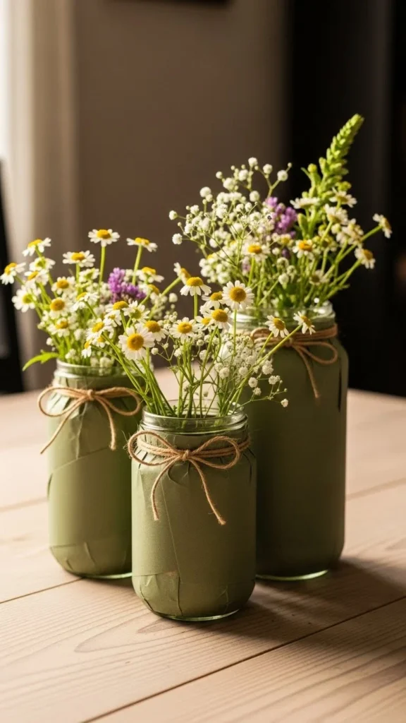 Wrap jars with green paper and tie with twine. Add faux greenery inside. This works well for casual dining and group tables.