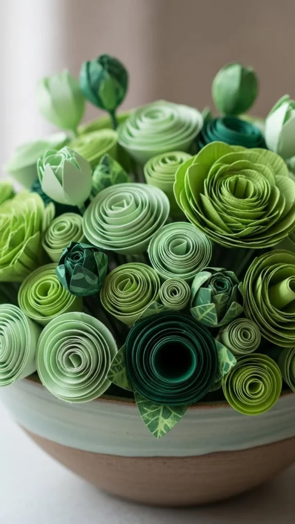 Roll green paper into flower shapes and arrange them in a bowl. This adds texture and color using scrap paper.