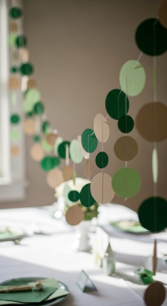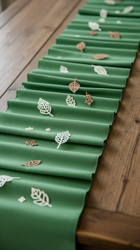 Use a folded green cloth with small paper decorations spaced evenly. This works well for long tables.