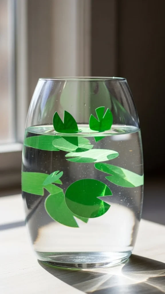 Add green paper shapes inside a clear vase with filler. This gives a clean and simple look.