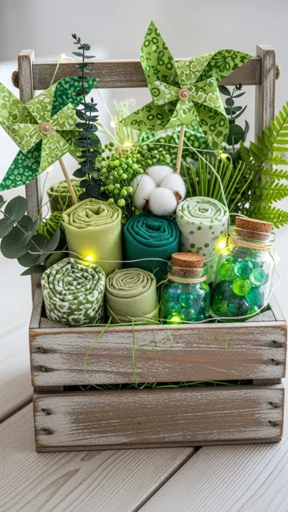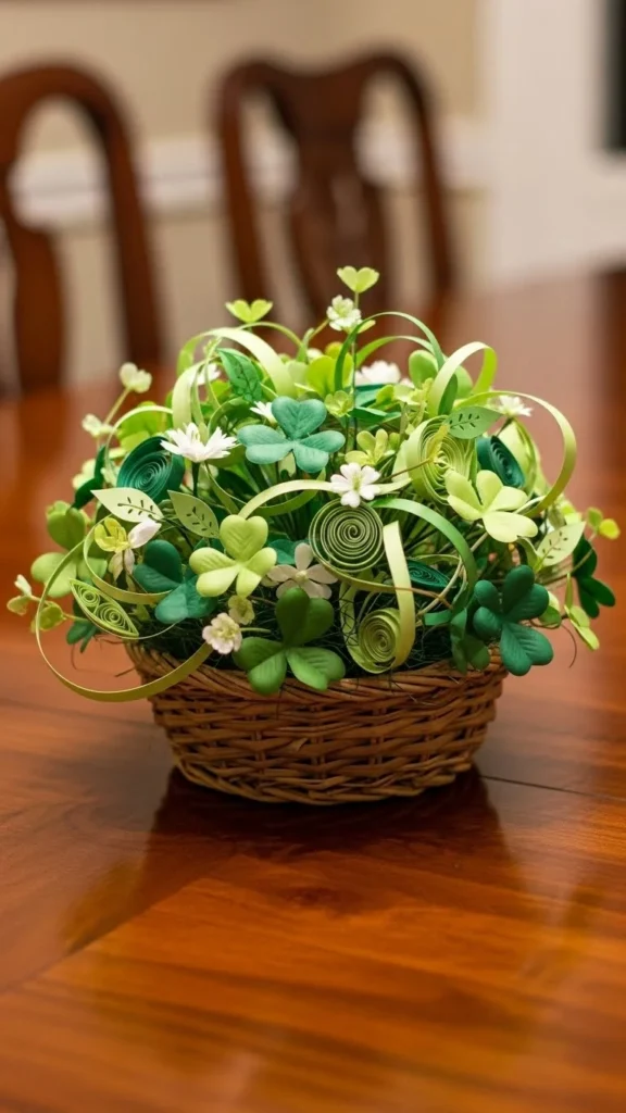 Use a small basket and fill it with faux clovers or paper stems. This adds texture and feels relaxed. Baskets are reusable for other seasons by swapping contents.
