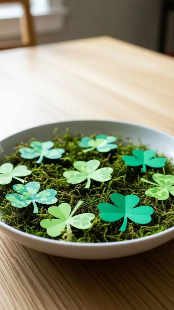 Use a low bowl and fill it with craft moss or shredded green paper. Place paper clovers loosely on top. This centerpiece stays low, making conversation easy across the table. Craft moss can be reused later, and paper clovers are quick to cut. Neutral bowls help the green tones stand out clearly.