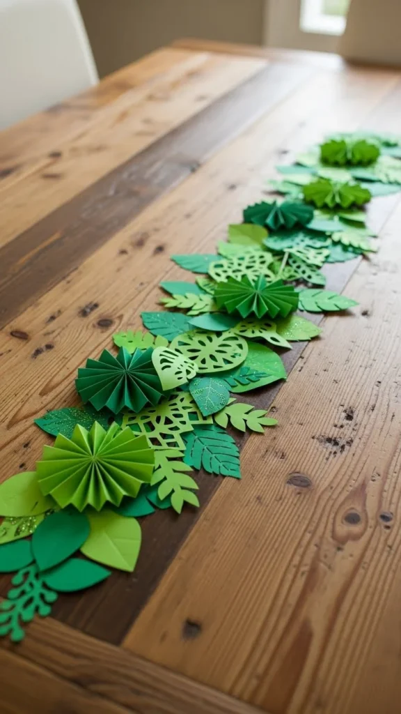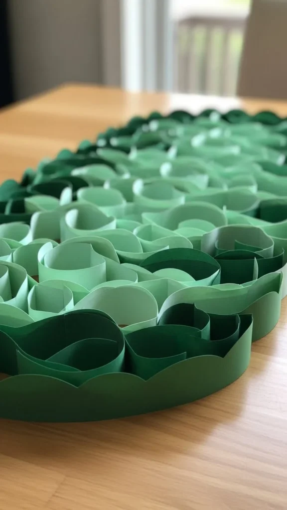 Cut green paper strips with scalloped edges and arrange them across the table. This uses simple tools and stores flat for reuse.