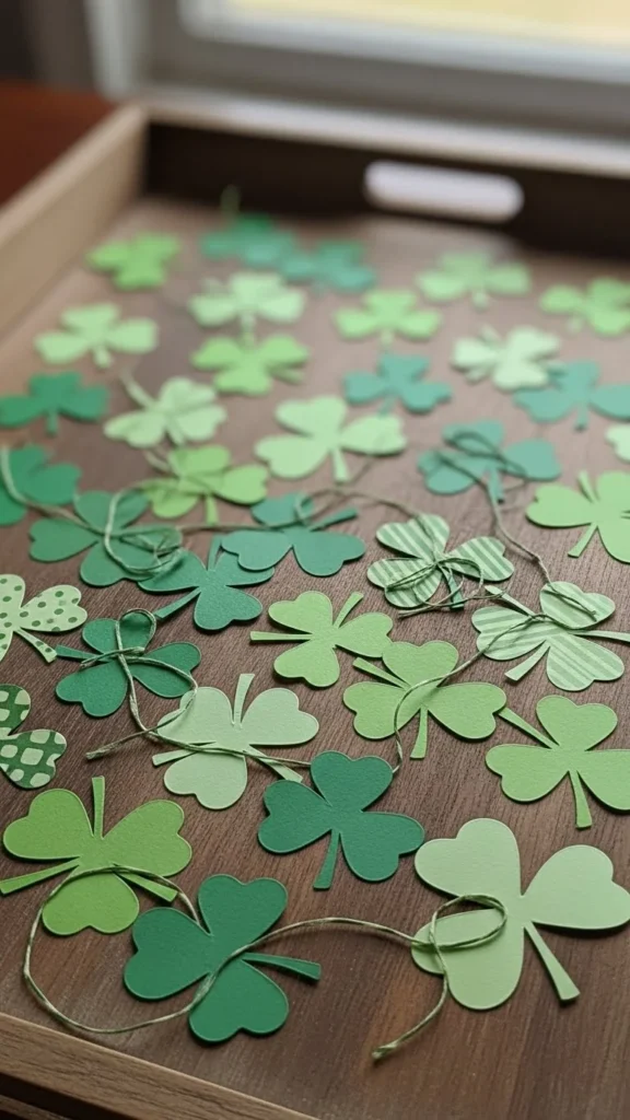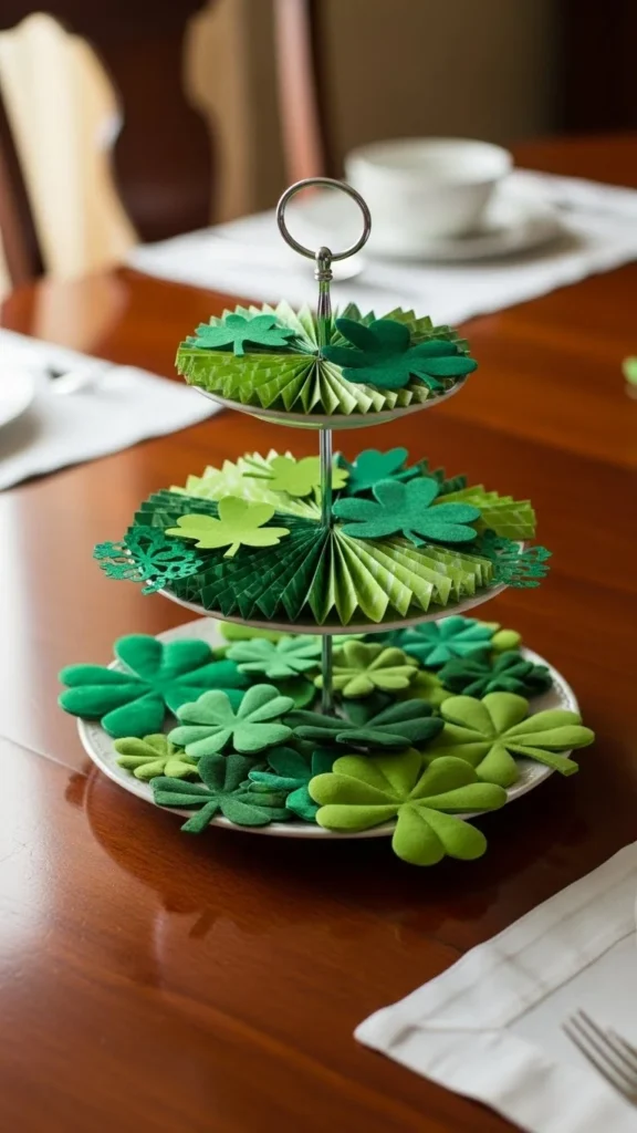 Line a tray with faux grass or green paper strips. Add paper clovers lightly on top. This creates a clean table focal point.