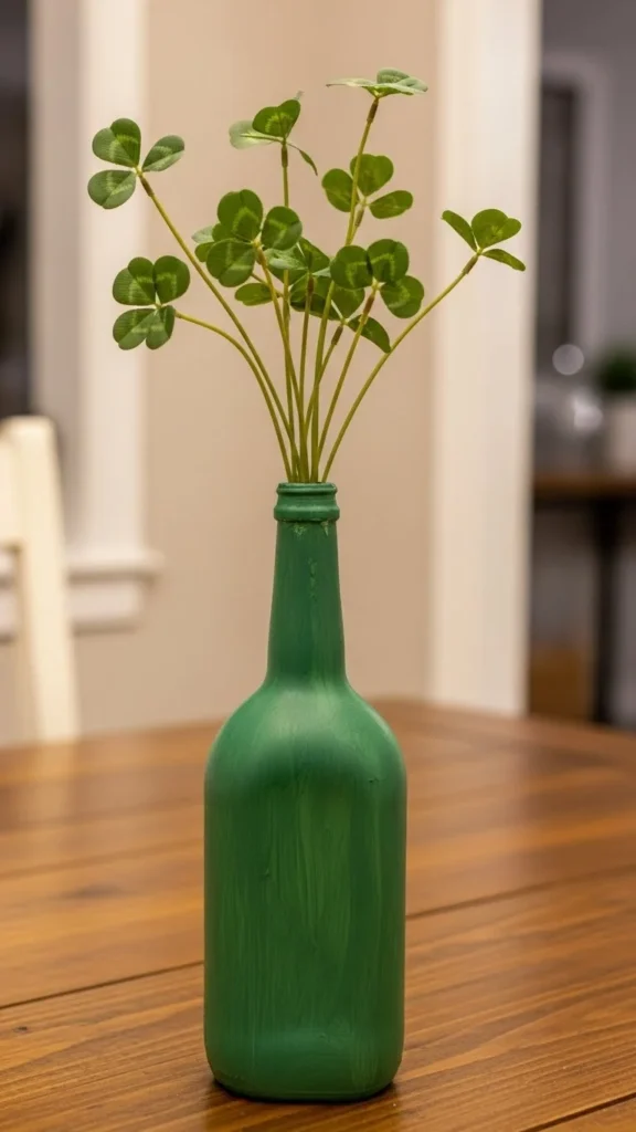 Paint an empty bottle green and let it dry fully. Add faux or paper clover stems inside. This is a simple way to reuse bottles instead of throwing them away. One bottle works for small tables, while several can be placed in a row for larger setups.