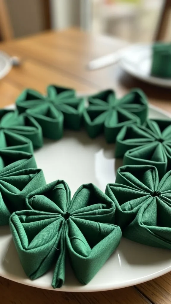 Fold green cloth napkins into clover-inspired shapes and arrange them on a plate. This centerpiece costs nothing extra and looks tidy. After the meal, simply unfold the napkins and use them normally.