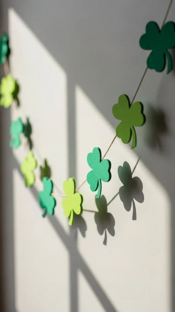 This project works well with kids and takes very little time. You can make it longer or shorter based on your space. After the holiday, store the clovers flat in an envelope and reuse next year. It adds color without permanent changes or wall damage.
