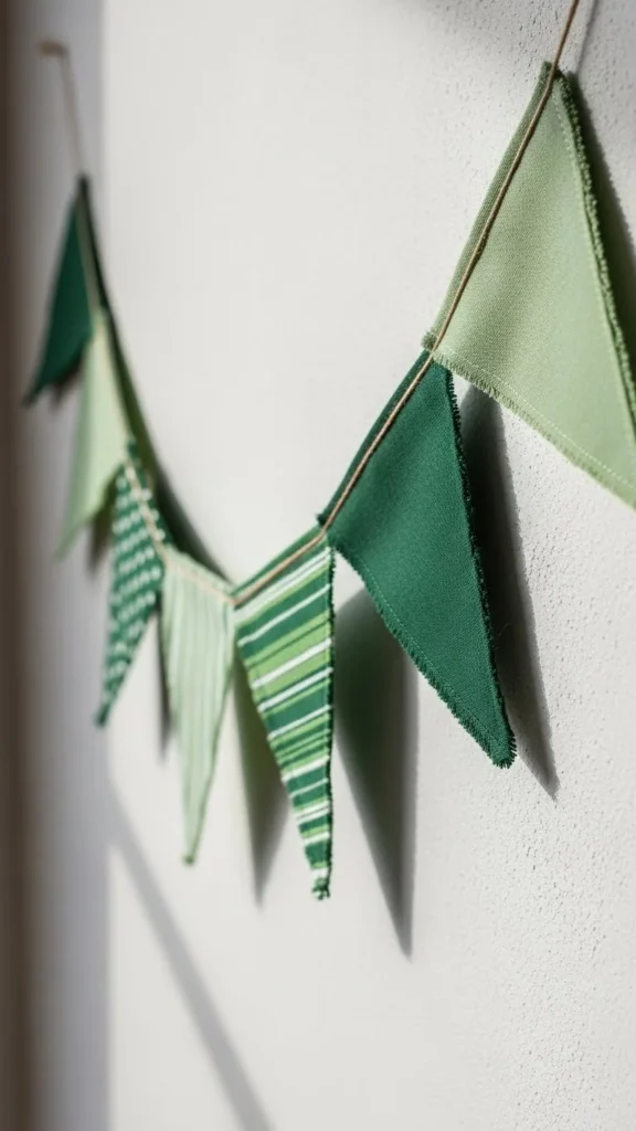 Hang the garland over a couch, shelf, or doorway. Keep spacing uneven so it feels relaxed. If you want more depth, mix two shades of green. For a budget-friendly twist, recycle old folders or magazines with green tones.