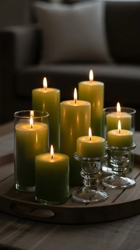 Group candles of different heights. Use battery options for safety. Place on a tray to keep things tidy.
