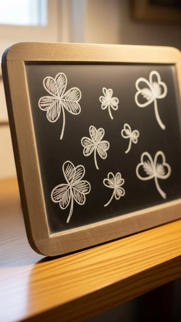 Draw clovers using white or green chalk. Keep designs simple. Lean the board on a shelf.