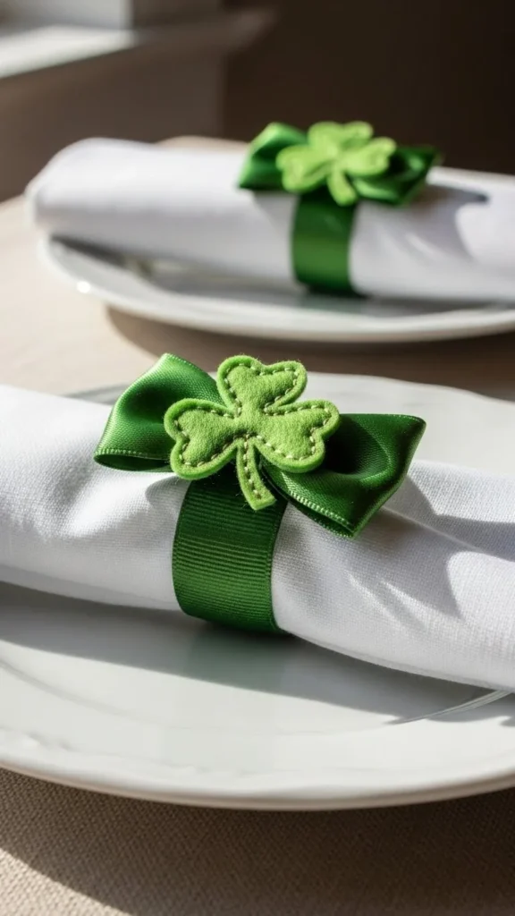 Wrap ribbon around cardboard rings. Glue small clovers on top. Use with plain napkins.