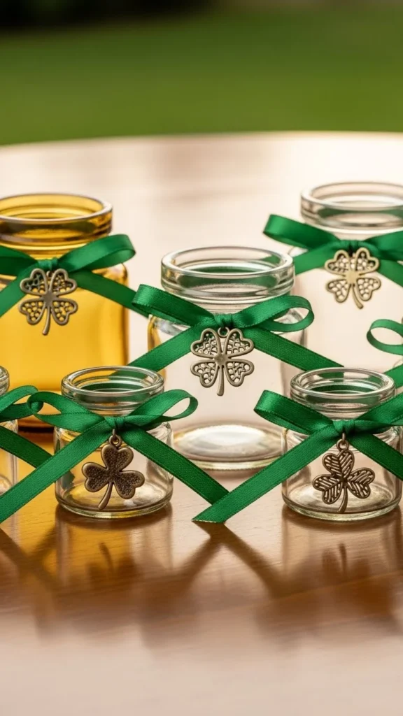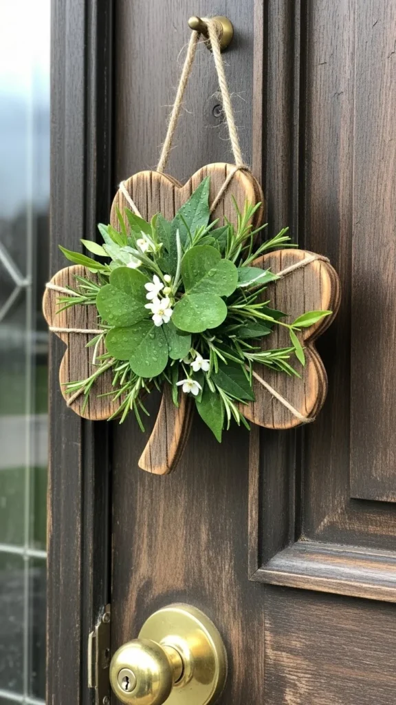 A door hanger sets the tone before guests even walk in. Cut a shamrock shape from cardboard or thin wood. Paint it green or leave it natural for a simple look. Add faux greenery or ribbon at the top.