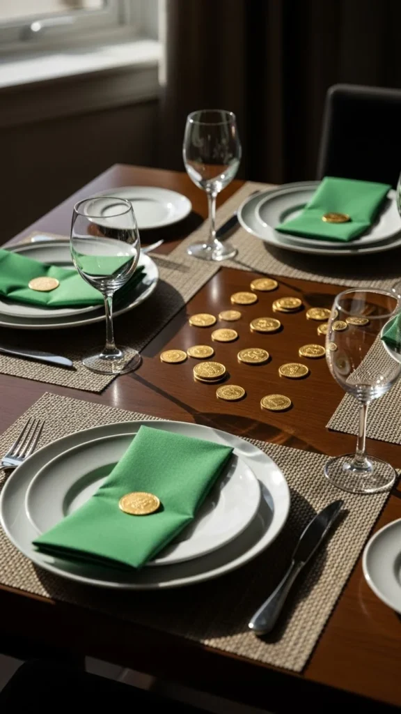 Keep the table balanced by using white or neutral dishes. This prevents the gold from feeling overwhelming. You can reuse the coins year after year.