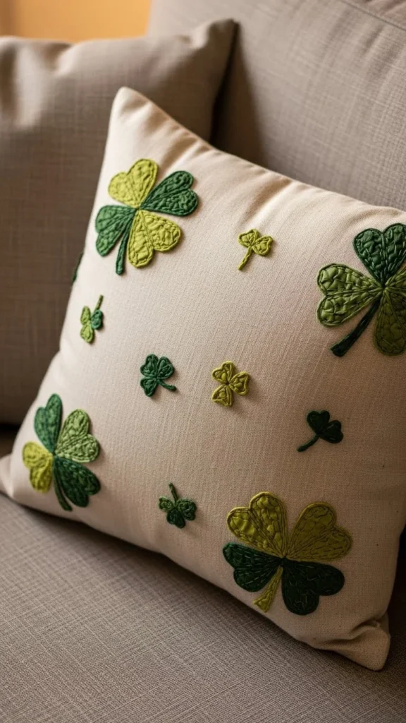 Turn fabric scraps into decor by sewing or gluing clovers onto an old pillow cover. Use felt, cotton, or leftover clothing. Keep the shapes simple and flat.