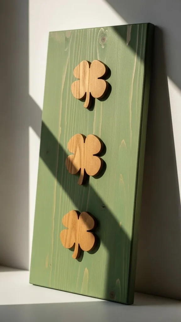 Cut clover shapes from thin wood or foam sheets. Paint them green or white and glue onto a stained or painted board. Keep spacing uneven for a handmade look.