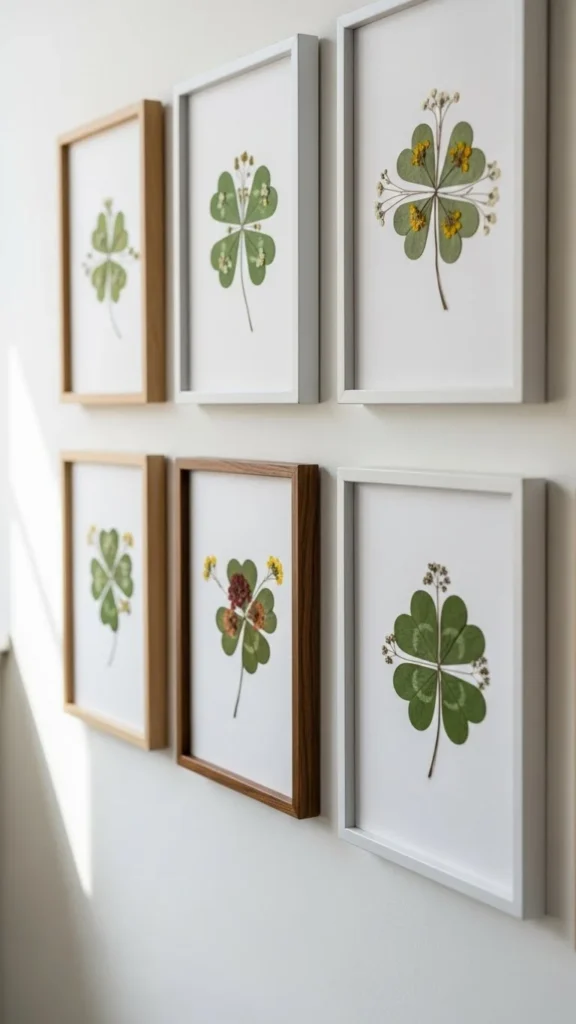 Print or draw clovers on plain paper and frame them. Use frames you already own. Keep the background white for contrast.