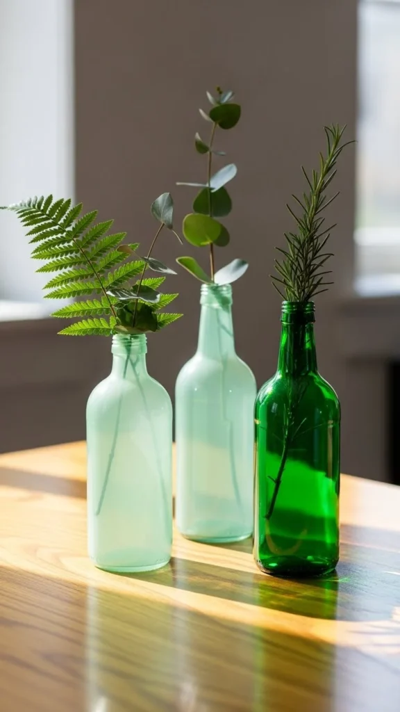 Paint glass bottles green or leave them clear and add green stems. Use faux plants to avoid maintenance. Group bottles in odd numbers.