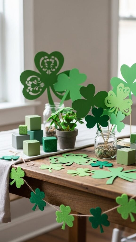 Paper clovers are one of the easiest ways to decorate fast. Start with green craft paper, scrapbook leftovers, or even old gift wrap. Cut heart shapes and glue three together to form each clover. This keeps the shapes consistent without fancy tools. Punch a small hole at the top and thread twine or string through.