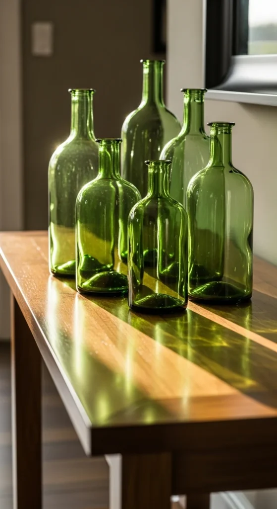Green glass bottles add shine and color without extra decor. Collect bottles in different heights. Thrift stores are great for this. Clean them well and remove labels. Arrange in groups of three or five for visual rhythm. Leave them empty or add simple stems. Place near windows where light can pass through the glass. This setup feels eye-catching yet simple, making it ideal for modern or farmhouse homes.