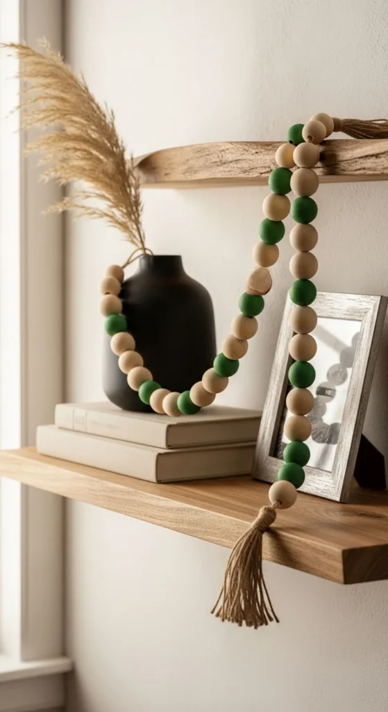 Wood bead garlands gain energy with painted sections. Use unfinished beads and paint every third bead green. String with cotton cord. Drape across mantels or shelves. This adds color without overwhelming the space. Beads store easily and can be reused with different colors later.