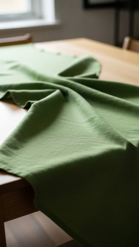 Fold a green cloth lengthwise and place it across the table. This adds softness and works well for casual hosting. Use fabric you already own.