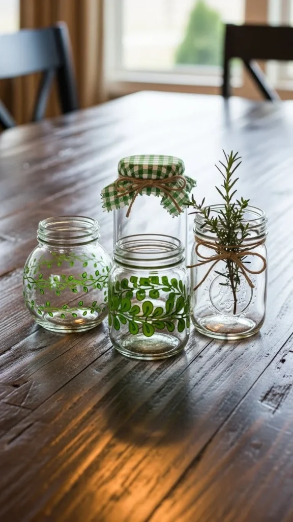 Wrap clear jars with green ribbon and place them along the table. These jars can hold utensils, napkins, or greenery. Using items you already have keeps costs low.