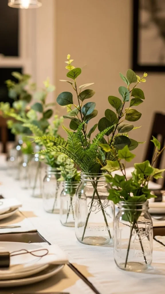 Fill mason jars with faux greenery or paper stems and place them evenly down the table. This décor is easy to scale for small or large tables. Jars you already own help keep costs down. Add twine around the jar neck for texture. When hosting ends, reuse the jars for storage or other décor.
