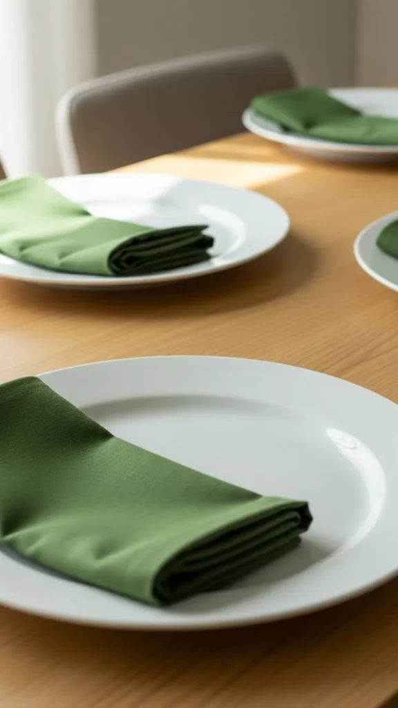 Fold green cloth napkins into simple shapes and place them beside plates or on top of them. This adds color without adding clutter. Cloth napkins feel intentional and can be reused many times. Even basic folds look polished when colors are consistent.