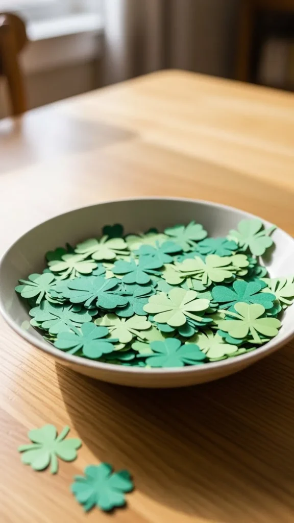 Use a shallow bowl and fill it with paper clovers or green paper shapes. Keep the height low so guests can see each other easily. This centerpiece works well for conversation-friendly hosting. Use a neutral bowl to let the green details stand out.