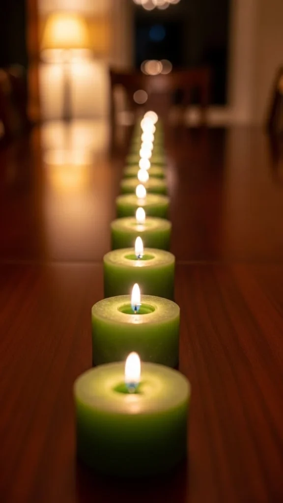 Place small green candles down the center of the table with even spacing. This adds rhythm and balance to your setup. Use candles you already own to save money. Keep them low so they do not block views across the table.