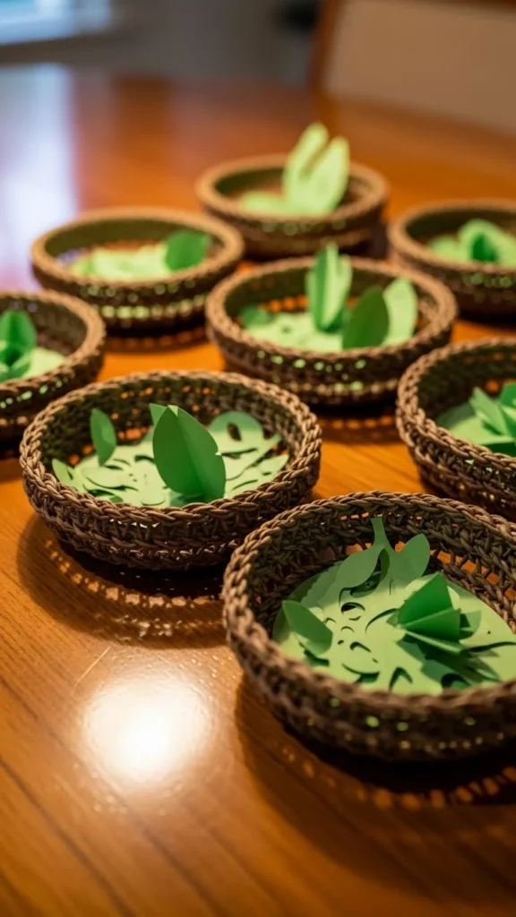 Use small baskets filled with paper clovers or greenery. Baskets add warmth and texture to the table. This décor is reusable for other seasons by changing the contents. Space baskets evenly for a balanced look.